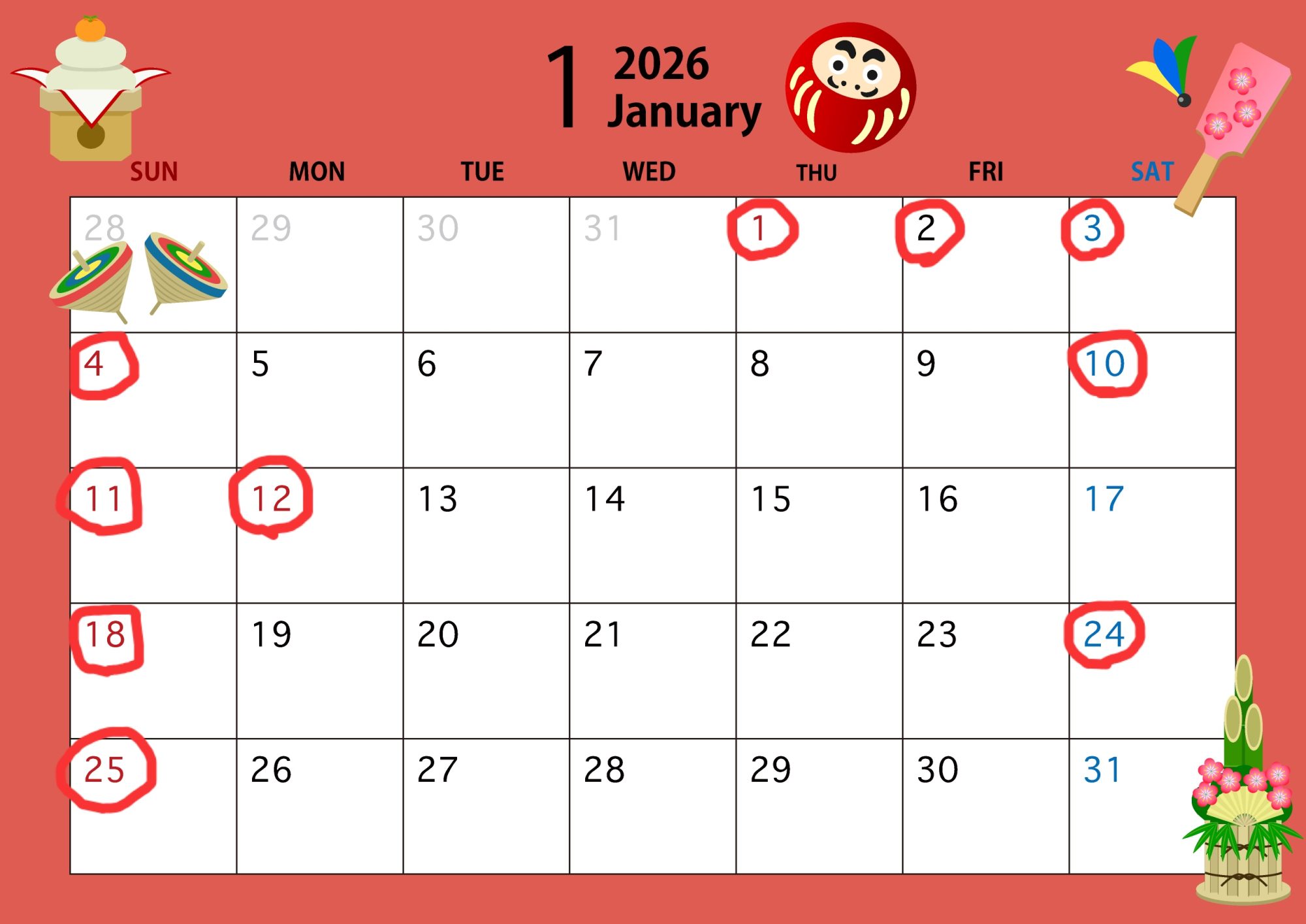 (休暇期間) 2025年12月28日(日) ~ 2026年 1月 4日(日)
